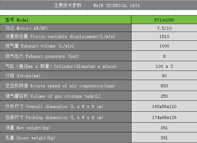 標題:FT100250 新型節能環保活塞空壓機 7.5kW/10HP
