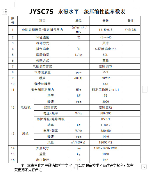 產(chǎn)品名稱:75kW 水平雙級直連永磁變頻空壓機 JYSC75